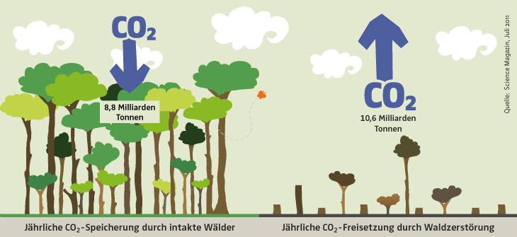 Regenwälder entziehen der Atmosphäre CO2 und geben stattdessen Sauerstoff ab. Wird Regenwald abgeholzt, steigen große Mengen Kohlendioxid in die Atmosphäre, die vorher in den Wäldern gebunden waren. Abholzung von Regenwald trägt erheblich zur Klimaerwärmung bei (10-20%).