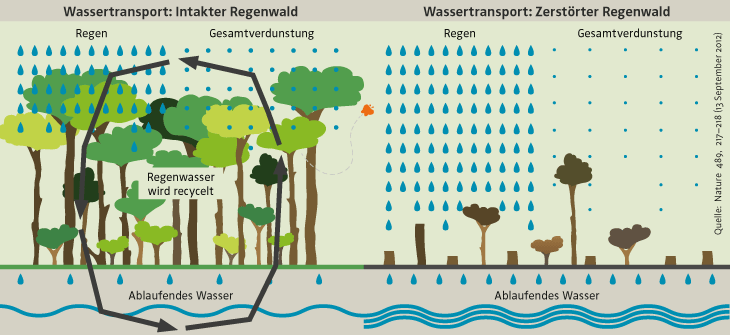 Ohne Bäume fließt Regen einfach ab und wird nicht an die Atmosphäre zurückgegeben, es können sich keine Wolken mehr bilden. Darauf folgen Dürren und die Austrocknung von Flüssen - Wasserressourcen für Menschen und Tiere sind bedroht.
