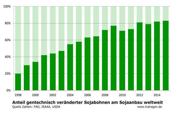 2015 wurde auf 83 % der globalen Sojaanbaufläche transgenes Saatgut verwendet.[5]